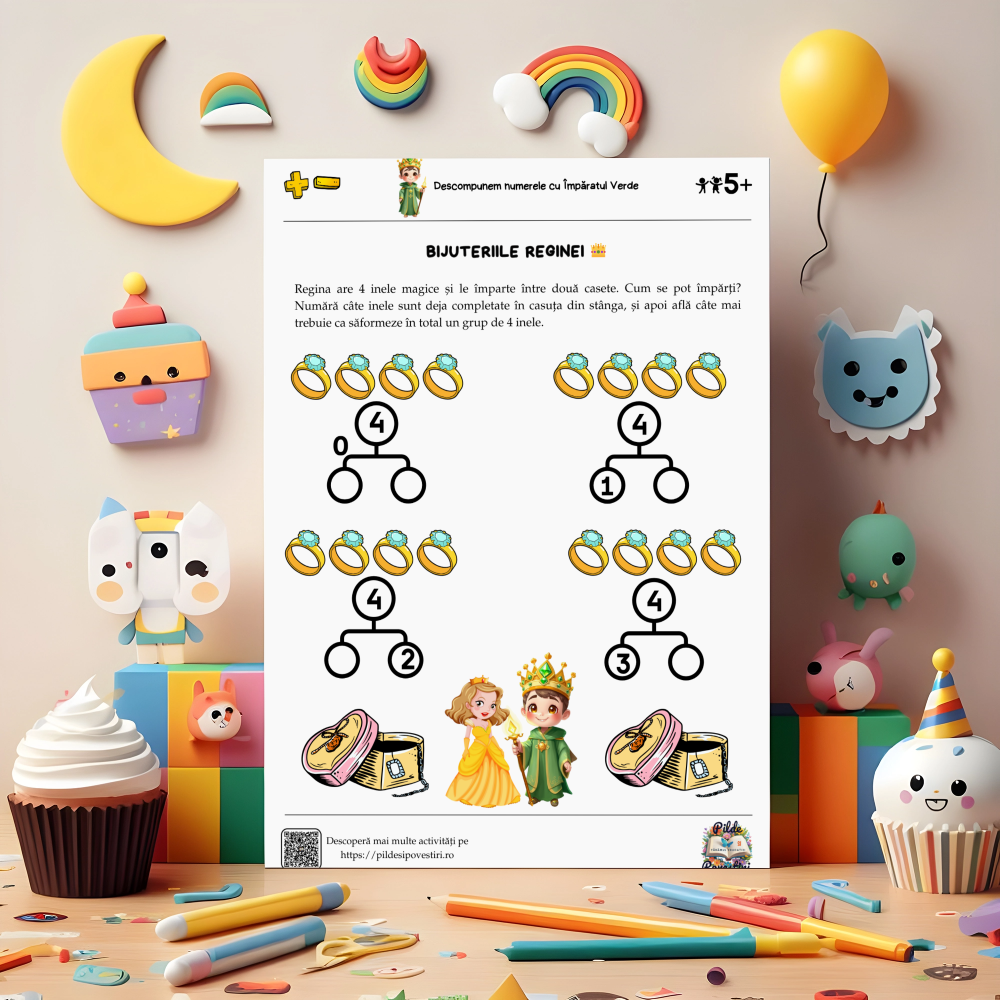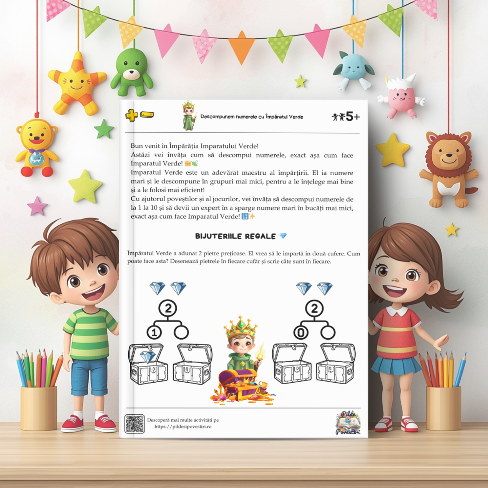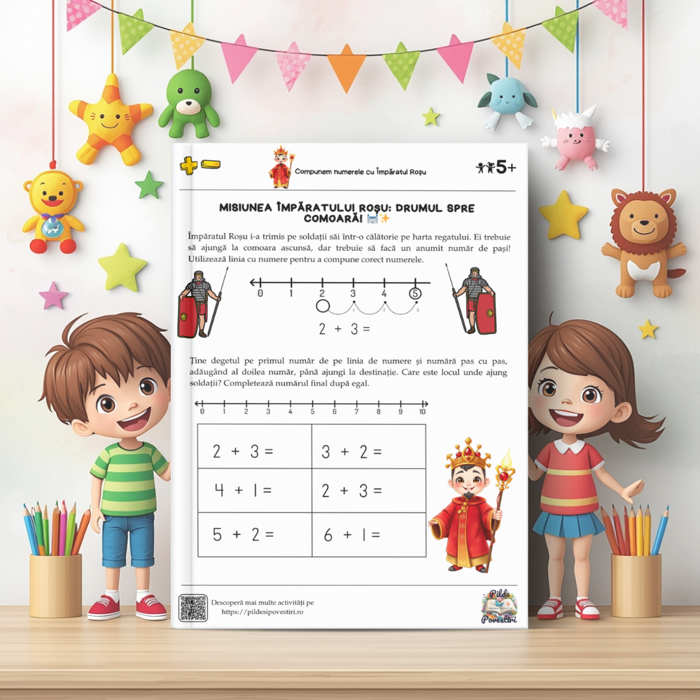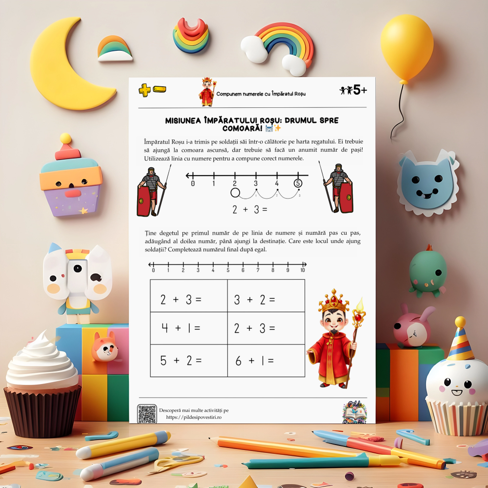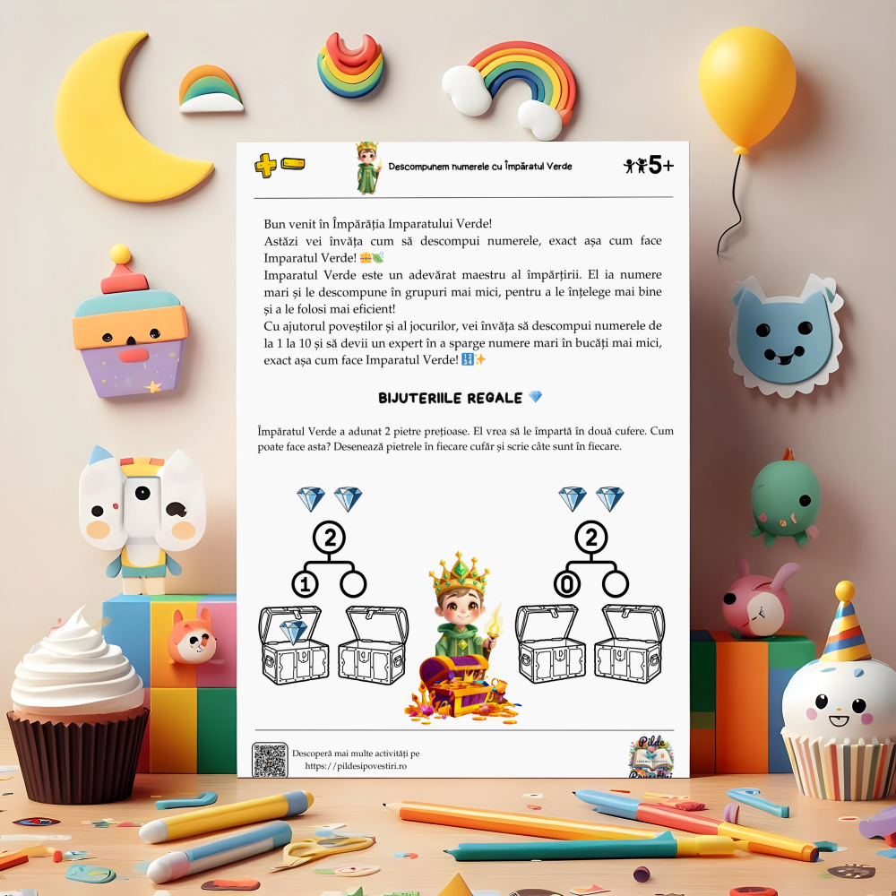 ✔️ Activități variate: alegerea răspunsurilor corecte, împărțirea comorilor împăraților, identificarea combinațiilor pentru fiecare număr