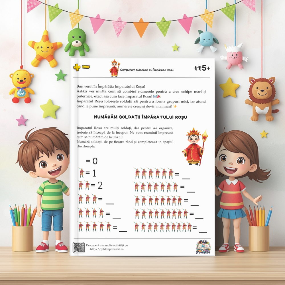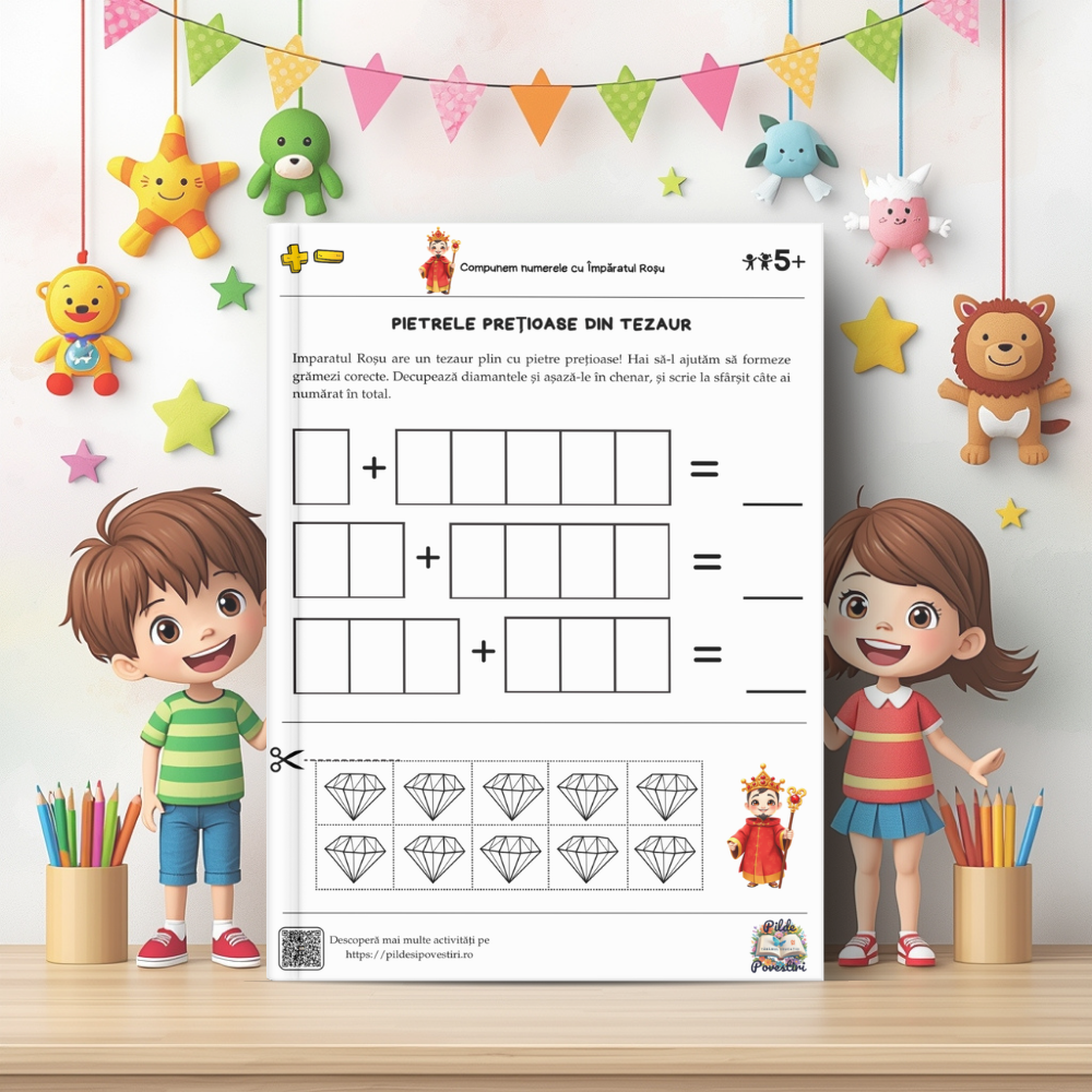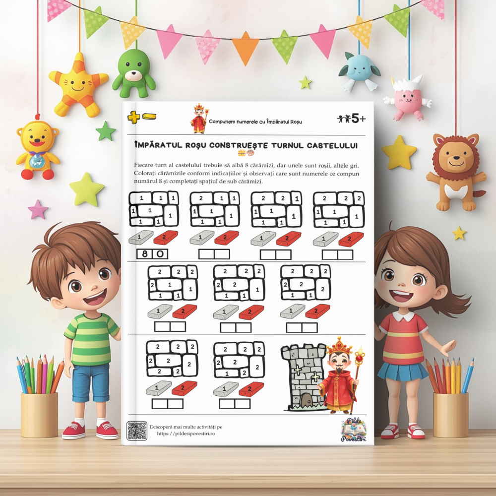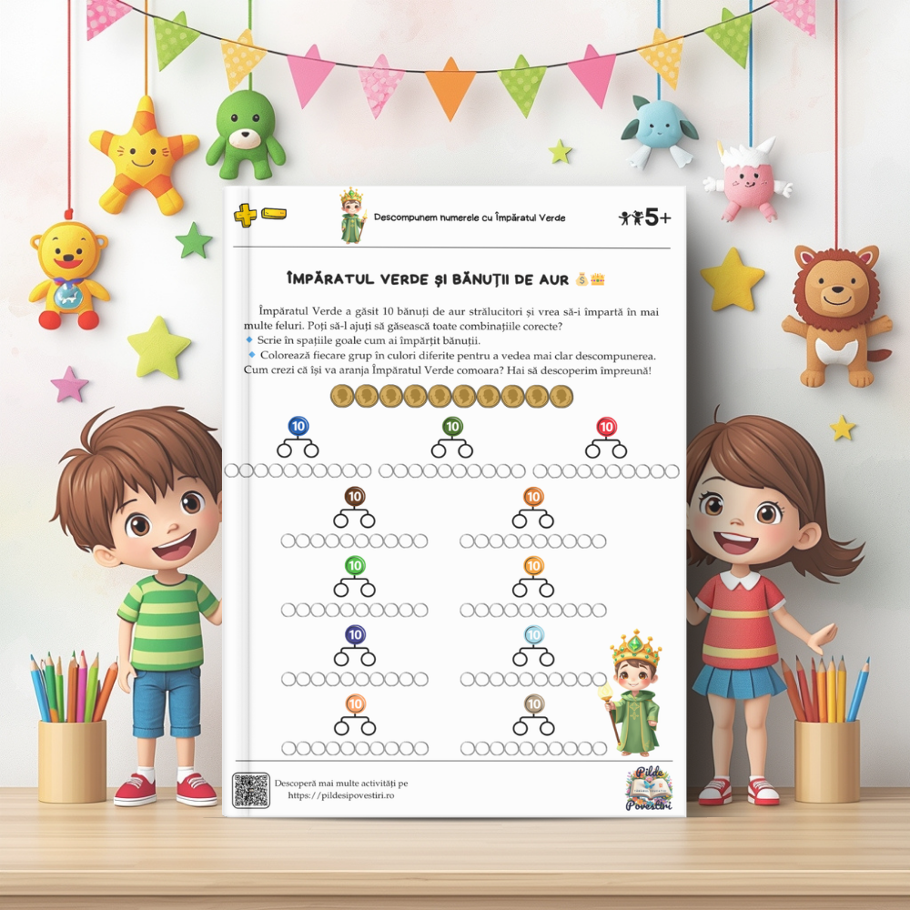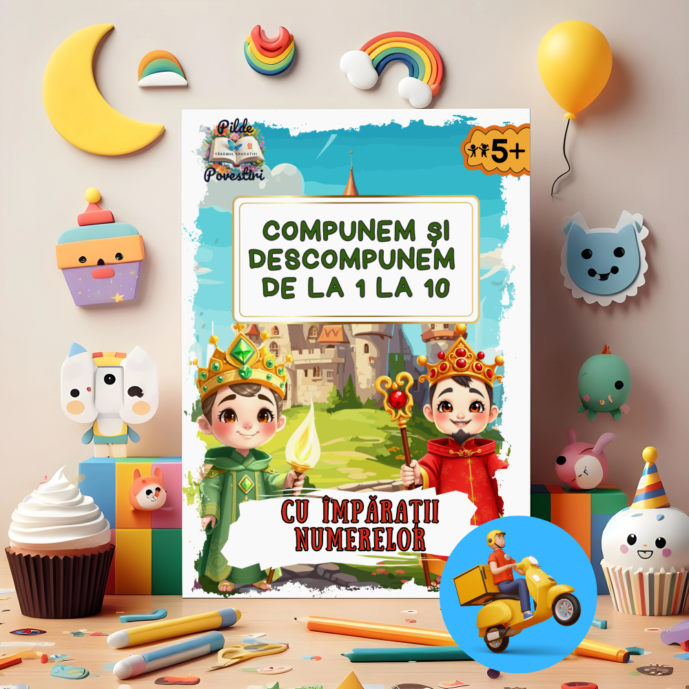 Această mapă educativă colorată conține 30 de fișe captivante, prin care micii exploratori vor învăța să compună și să descompună numerele de la 1 la 10 – totul prin jocuri, provocări și activități interactive.