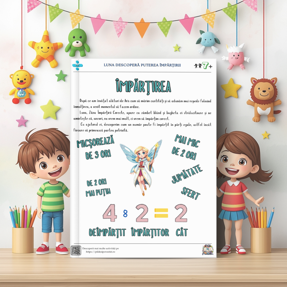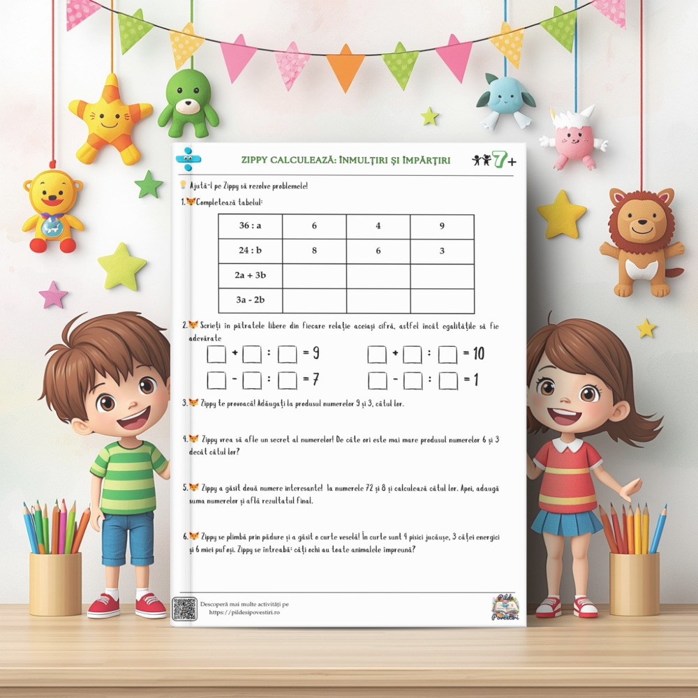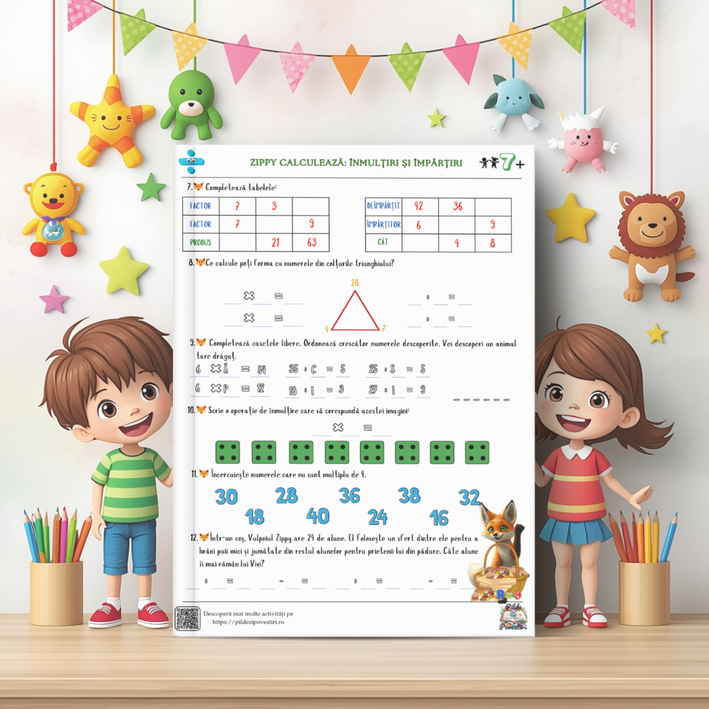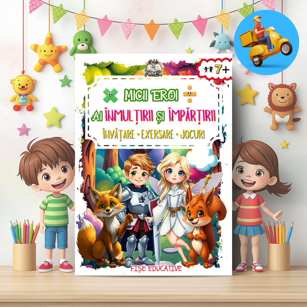 Alături de personajele din poveste – Vivi, Zippy, Luna și Aris – cei mici vor exersa tabla înmulțirii, împărțirea pas cu pas și probleme logice prin jocuri, rebusuri, labirinturi și exerciții interactive.