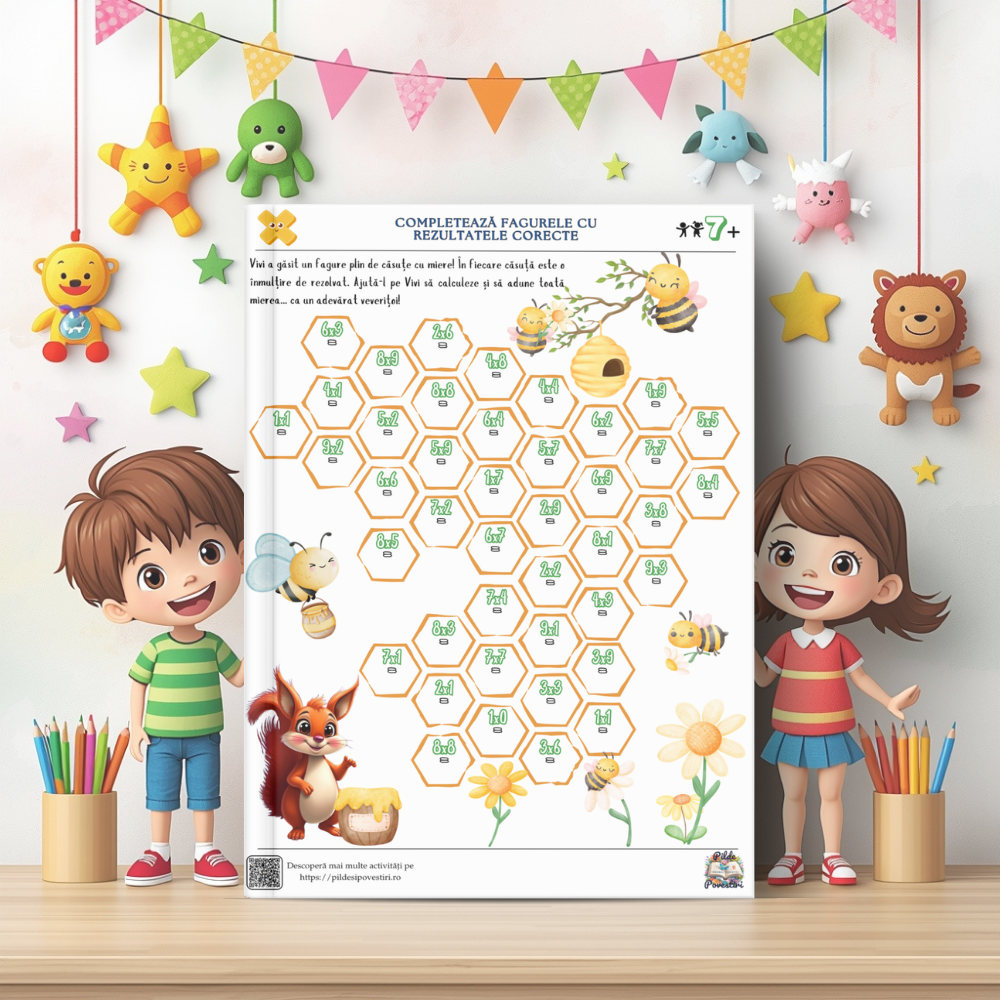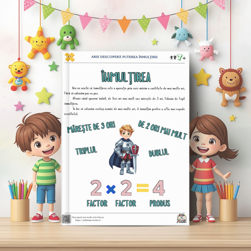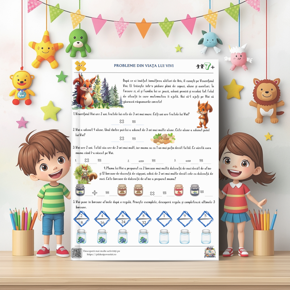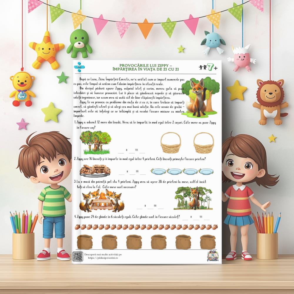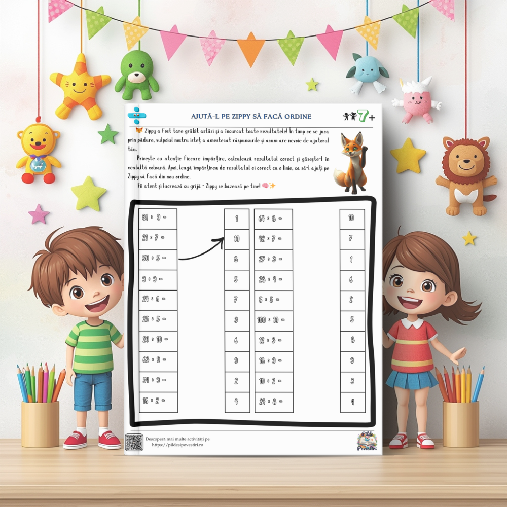 Alături de personajele din poveste – Vivi, Zippy, Luna și Aris – cei mici vor exersa tabla înmulțirii, împărțirea pas cu pas și probleme logice prin jocuri, rebusuri, labirinturi și exerciții interactive.
